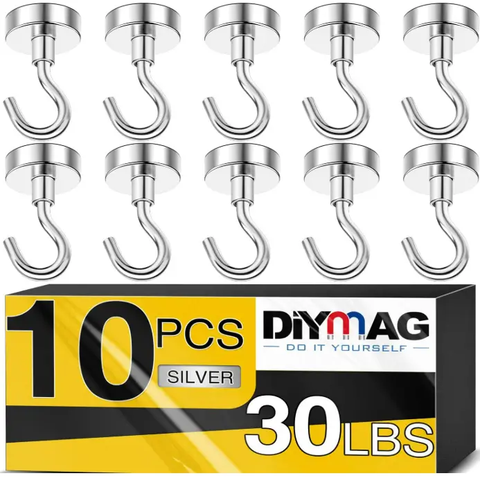 DIYMAG Magnetic Hooks for Hanging Cubicle Accessories, 30lbs 2025 Cruise Cabin Ship Essentials N52 Magnetic Hook Heavy Duty Strong Magnets Fridge for Classroom Beach Kitchen Grills 10 Pack Silver